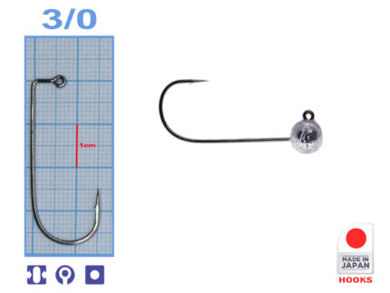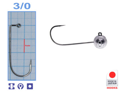 Clasicul model de carlig de jig (Aberdeen Jig) turnat pe microjiguri bila (jig fara guler) de 3gr (gramajul este inscriptionat pe bila). Aceste microjiguri sunt recomandate pentru armarea nalucilor soft mai subtiri, lipsa gulerului din plumb nedistrugand naluca dar pot fi folosite cu succes in combinatie cu orice tip de naluca soft. Marimea #3/0 este ideala pentru armarea nalucilor intre 6.5-8cm, in special pentru pescuitul salaului sau a stiucii.
