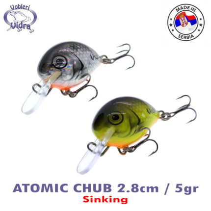 Acest model este recomandat in pescuitul pe rauri mici, medii sau mari , precum si pe lacuri. S-a dovedit a fi o naluca foarte eficienta in pescuitul cleanului sau a pastravului in apele rapide si relativ putin adanci, datorita stabilitatii sale. Are o vibratie foarte puternica si marunta si functioneaza excelent si atunci cand il recuperati mai repede. Fabricate in Serbia, au un corp din polimer, intarit, si bile metalica incorporate, emit un sunet provocator sub apa, care innebuneste pestii pradatori. Chiar si vara, in cea mai mare caldura, cand muscatura chiar si a celei mai apetisante momeli naturale este mai slaba, pestii nu refuza sa atace voblerele zgomotoase, cu bile. Datorita greutatii destul de mari (5gr) acesta poate fi lansat pe distante foarte lungi. Modelul Atomic Chub 2.8cm este un model eficient si potrivi pentru toate anotimpurile, un classic in pescuitul pe rau, care poate sa va aduc capturi de clean, pastrav, biban si chiar stiuca si salau.
