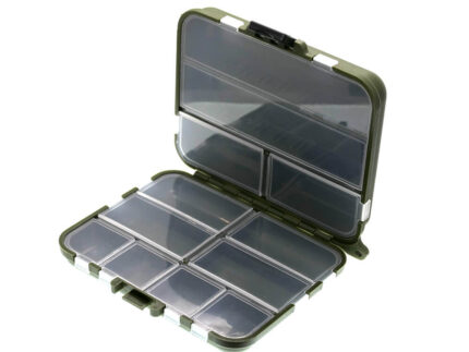 Cutie din plastic dubla, cu 5 compartimente pe fiecare parte, fiecare accesibil printr-o usita proprie. Acestea sunt usor de transportat datorita dimensiunilor reduse. Aceste cutii sunt recomandate pentru stocarea accesoriilor de pescuit: carlige, agrafe, varteje, plumbi mici, microjiguri, naluci foarte mici pentru pastrav, clean sau biban. Poate fi depozitata in orice buzunar.Ideala pentru toate stilurile de pescuit datorita utilitatii, dar si a accesului facil si a modalitatii simple de transport. Se preteaza pentru pasionatii oricarei tehnici de pescuit.Sistemul de inchidere cu balama intarita asigura o etanseitate perfecta, fara riscul pierderii continutului cutiei.
