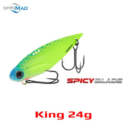 Spicy Blade King 24g este "greul" familiei de cicade, fiind special conceput pentru situatiile care necesita lansari la distante extreme si un control impecabil in ape adanci sau curenti puternici. Datorita constructiei fara plumb si a designului aerodinamic, aceasta nalucta este arma ideala pentru explorarea zonelor dificile unde alti pescari nu pot ajunge. Un avantaj al cicadei King 24 g este posibilitatea de a-i regla actiunea prin intermediul a trei orificii situate in partea superioara a nalucii. Datorita vibratiei distincte, a undei hidroacustice puternice si a versiunilor de culori atractive, cicada KING este una dintre cele mai bune cicade disponibile pe piata, creata pentru a prinde bibani mari, salai, stiuci si somni.
