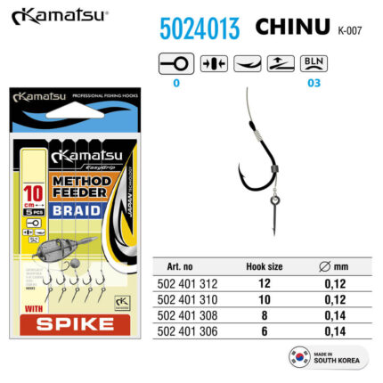 Kamatsu carlige legate cu fir textil 10cm, 0.12mm, pentru Method Feeder + Spike, model Chinu #10 (5buc/plic)