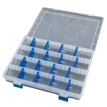 Cutie farbricata din material plastic transparent, cu 20 compartimente ce permit stocarea accesoriilor de pescuit: carlige, agrafe, varteje, plumbi, monturi, jiguri, naluci, etc. Ideale pentru toate stilurile de pescuit datorita utilitatii, dar si a accesului facil si a modalitatii simple de transport. Se preteaza pentru pasionatii oricarei tehnici de pescuit.