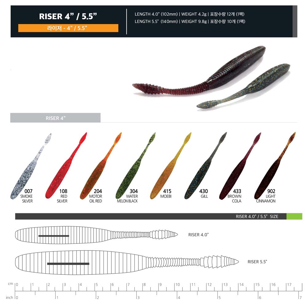 Riser is specially designed to catch fish while retrieving rather than falling. Inverted triangular shape body makes spiral fall. With strong jerking, the worm makes zig-zag darting action.