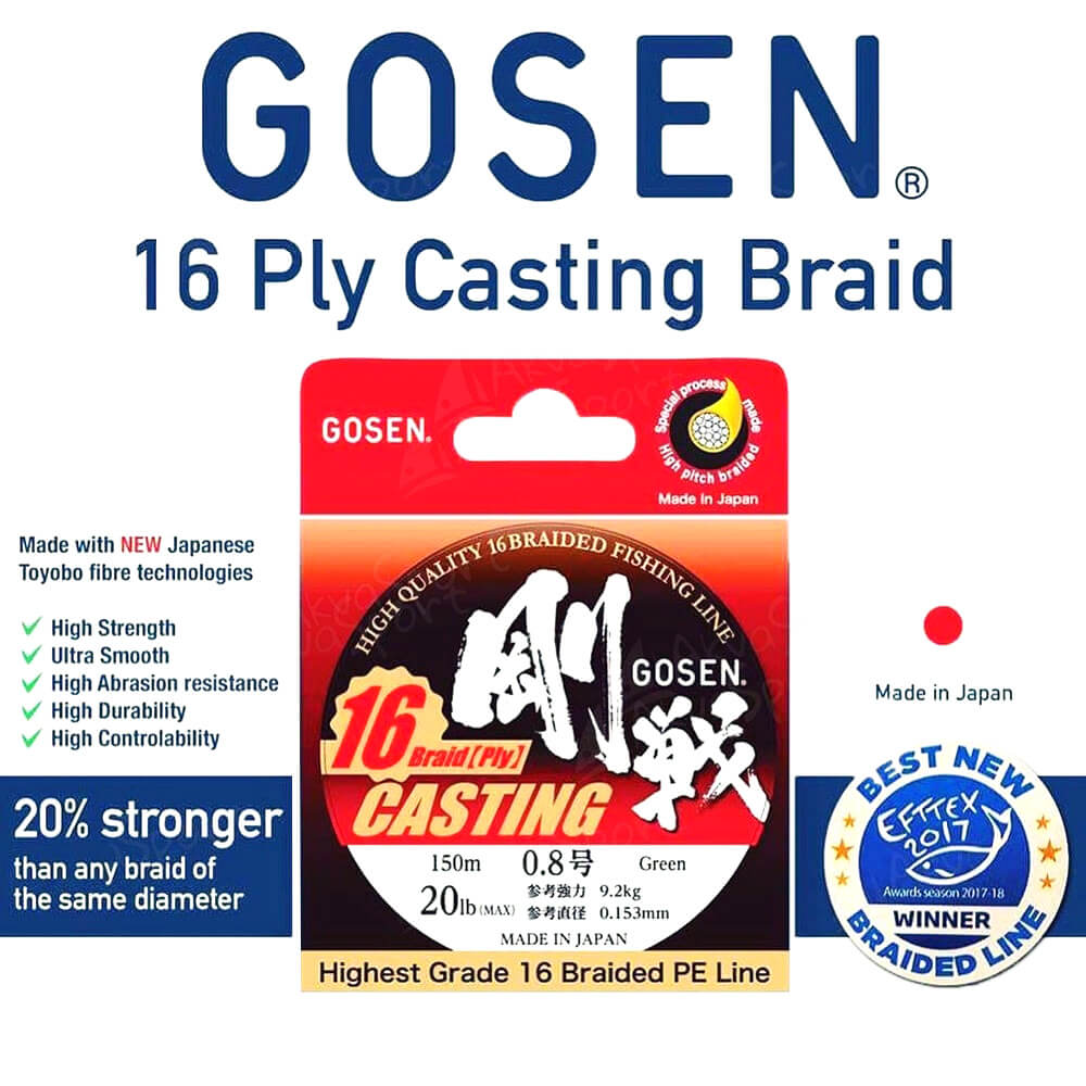 Made in Japan from high quality fibres braided in a high pitch process, Gosen 16 ply casting braid is an award winning, high quality casting braid. Extremely thin for its diameter, this braid was designed to perform where ultra long casts are required.