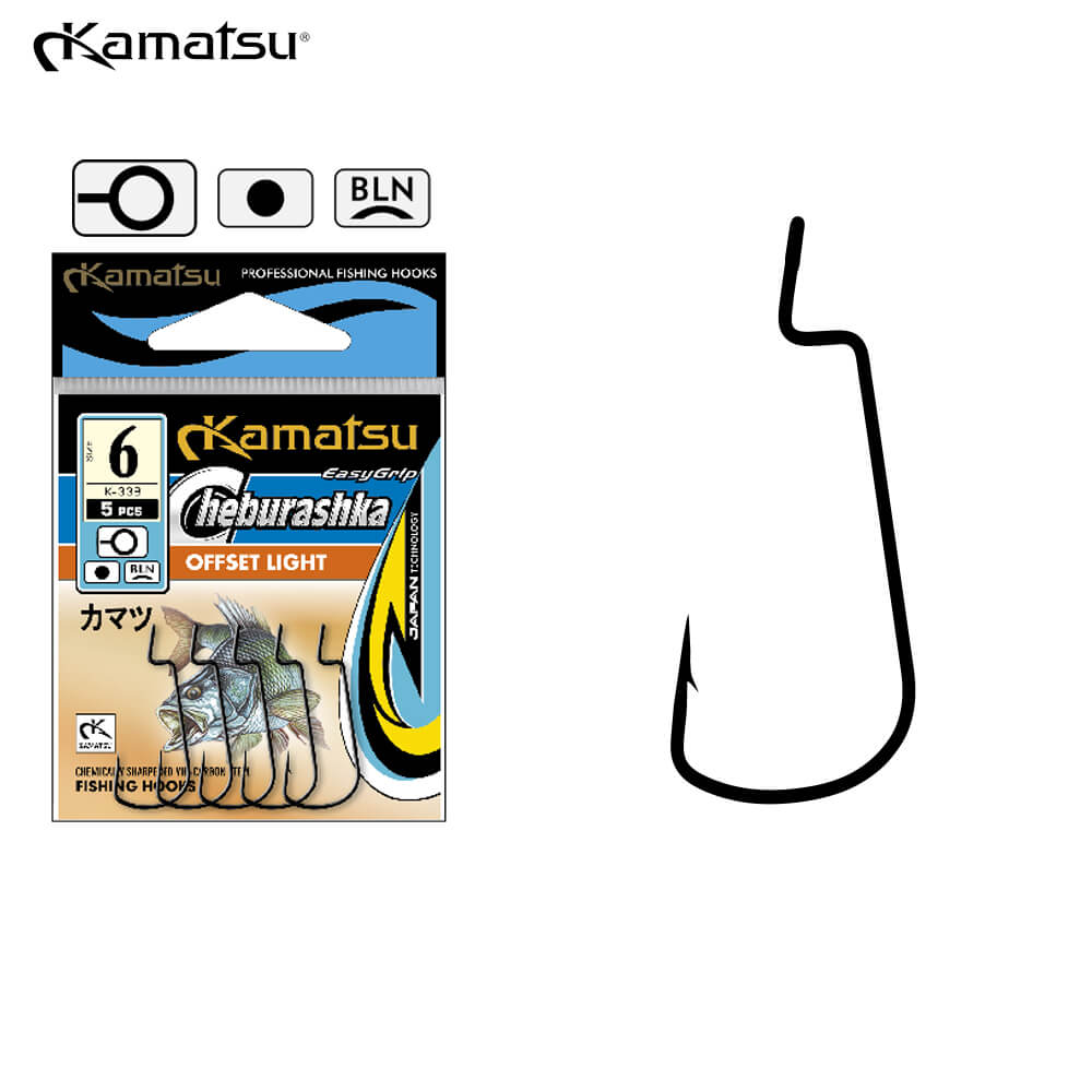 Cele mai mici carlige de offset din oferta producatorului Kamatsu. Marimi mici incepand cu nr.10 pana la nr.1, ideale pentru pescuitul UL sau L. Carlige Offset foarte subtiri si extrem de ascutite fabricate din otel carbon. Datorita ochetului larg, pozitionat perpendicular pe axul carligului, naluca va avea o evolutie foarte natural mai ales daca se foloseste in combinate cu bile cheburashka (jig-articulat).Varful carligului va iesi de fiecare data foarte usor din naluca siliconica, ceea ce face sa intepati mai usor pestii rapitori chiar si atunci cand aveti cele mai subtile muscaturi. Folosirea acestui tip de carlig, ne permite sa exploram zonele cu agataturi sau vegetatie, deoarece varful carligului se ascunde foarte bine in corpul nalucii. Trebuie sa avem in vedere ca in momentul atacului intepatura trebuie sa fie ferma astfel incat varful carligului sa iasa din corpul nalucii. Carligele sunt fabricate din otel mai subtire, recomandare noastra este de a fi pescuite cu fire mai subtiri si lansete mai fine. Recomandarea noastra de carlig offset mai puternic este modelul Kamatsu Offset Heavy