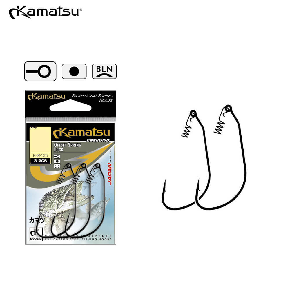 Kamatsu Offset Spring Lock – carlige offset cu deschidere mare prevazute cu un arc. Excelente pentru pescuitul pestilor rapitori cu naluci siliconice. Extrem de ascutite si rezistente. Gama larga de marimi va va permite cu usurinta sa armati momeli de orice dimensiune. Varful carligului va iesi de fiecare data foarte usor din naluca siliconica, ceea ce face sa intepati mai usor pestii rapitori chiar si atunci cand aveti cele mai subtile muscaturi. Aceste carlige offset au o deschidere mare, care ne permite sa folosim shaduri sau alte naluci soft, avand corpul lat. Folosirea acestui tip de carlig, ne permite sa exploram zonele cu agataturi sau vegetatie, deoarece varful carligului se ascunde foarte bine in corpul nalucii. Trebuie sa avem in vedere ca in momentul atacului intepatura trebuie sa fie ferma astfel incat varful carligului sa iasa din corpul nalucii.