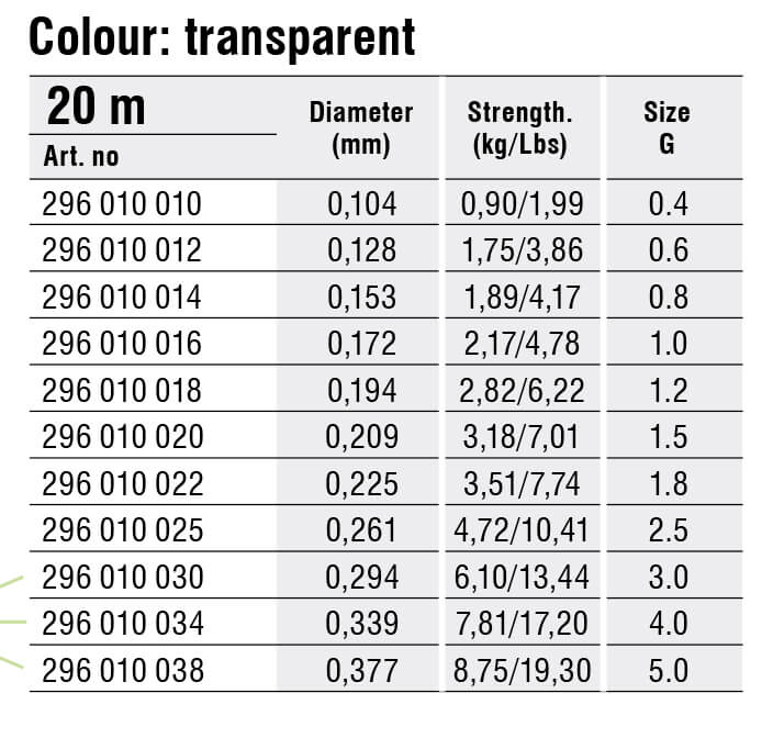 | 296010030 | 0.294mm | 6.1kg | transparent | rola 20m | 20 în stoc | 26,00 lei | | 0-294mm | 6-1kg | transparent | rola-20m | |||