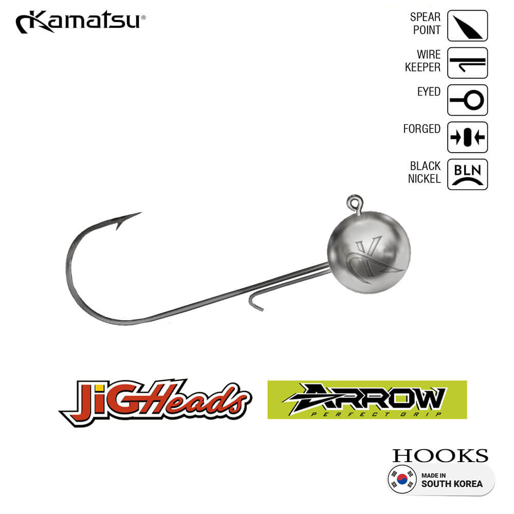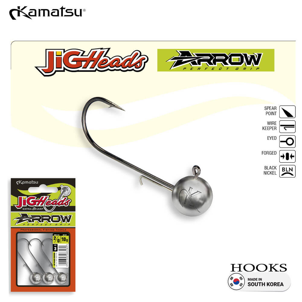 Jigurile Arrow Perfect Grip sunt  turnate pe carligele Kamatsu care sunt fabricate in Korea. Au varf ascutit cu laser, sunt forjate si foarte rezistente, fapt ce le-au facut favorite pentru o comunitate larga de pescari din intreaga lume. Sunt prevazute cu o tija metalica turnata in lestaj, care este suficient de subtire incat sa nu rupa guma dar in acelasi timp sa o tina si foarte bine fixata chiar daca folosim o naluca ingusta si subtire. In plus, gramajul si marimea fiecarui jig este inscriptionat pe bila, fapt ce ne ajuta sa pescuim intotdeauna cu gramajul dorit. Nu doar inteparea este ferma, ci si rezistenta lor, atunci cand pescuim in structuri submerse. Au curbura rotunda si ochetul inchis perfect pentru o buna protejare a nodului. Deschiderea destul de mare a curburii ne permite sa armam jigurile cu naluci care sa aiba un corp proeminent, mult aplatizat sub forma de shad (in special marimile mari 5/0-7/0). Marimea #5/0 este ideala pentru armarea nalucilor intre 8-10cm, in special pentru pescuitul salaului, stiucii sau somnului.
