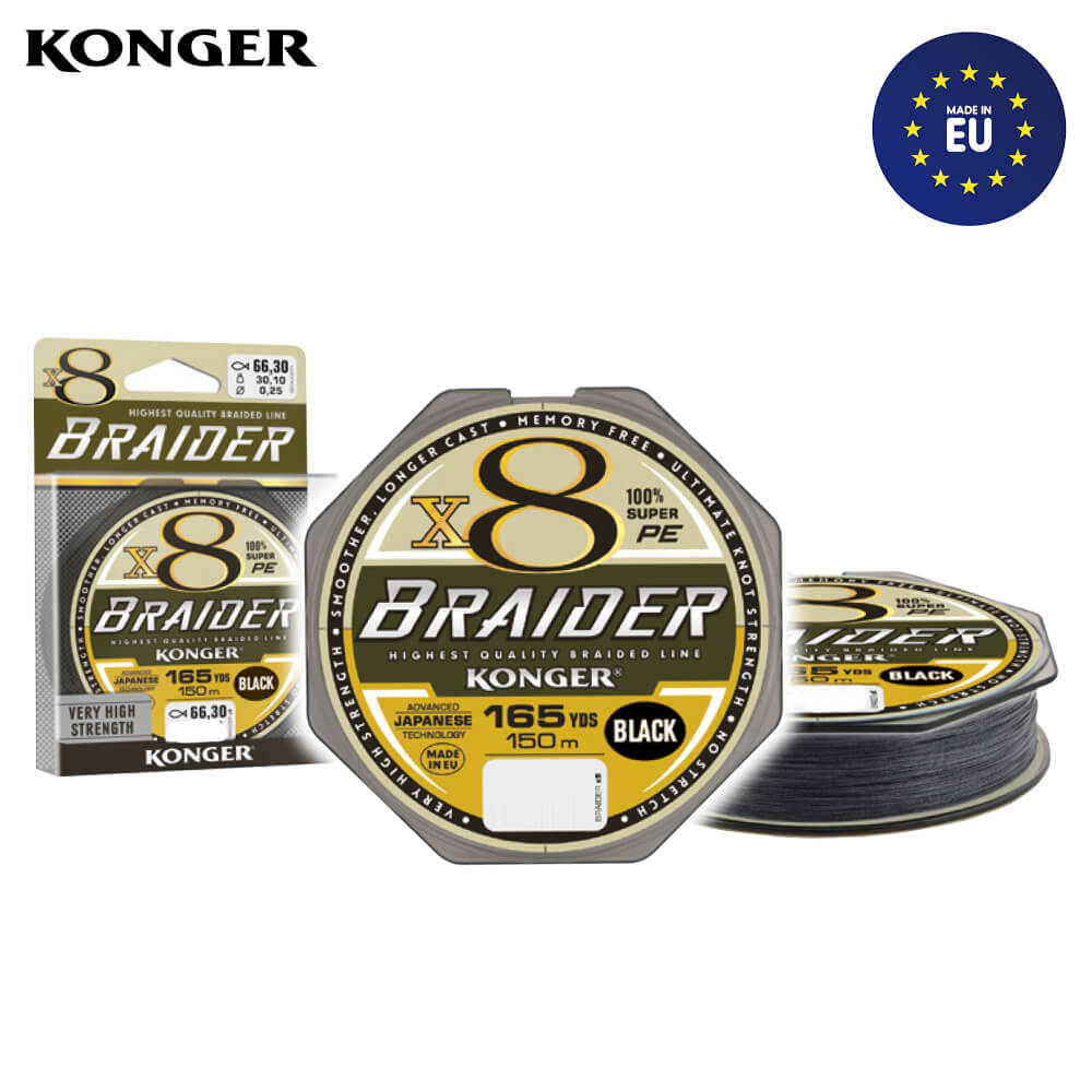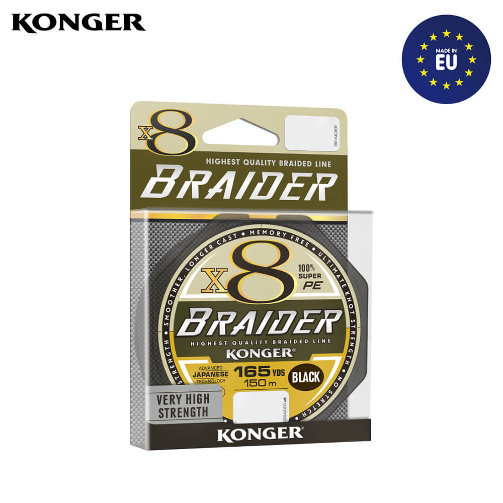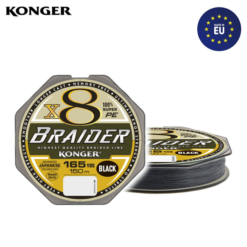 Konger Braider X8 este un fir textil impletit in 8 pentru pescarii exigenti. Culoare neagra si gama diversificata de diametre il recomanda in special in realizare monturilor pentru pescuitul la crap/method feeder dar poate fi folosit si in pescuitul la spinning. Rezistenta la abraziune, impletitura stransa, rezistenta la nod si alunecarea silentioasa prin inele , sunt doar cateva caracteristici excelente a acestui fir. Firul a fost testat atat in apa dulce cat si apa sarata si au trecut cu briou fiecare test la care a fost supus. Fabricat in UE.